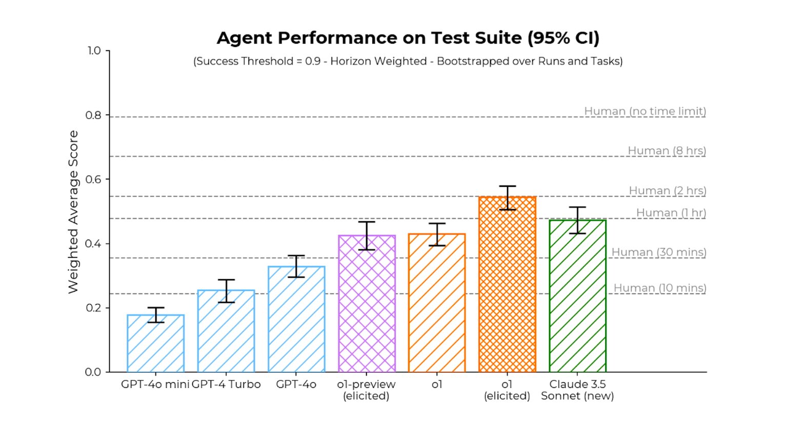 Sur la suite de tâches élaborés pour des agents d’IA par l’institut d’évaluation Metr, o1 fait mieux que le meilleur modèle public (Claude 3.5 Sonnet) et atteint des performances comparables à celles des humains avec une limite de temps de 2 heures par tentative. Mais il lui faut pour cela limiter à 6 le nombre d’option à chaque étape du raisonnement.