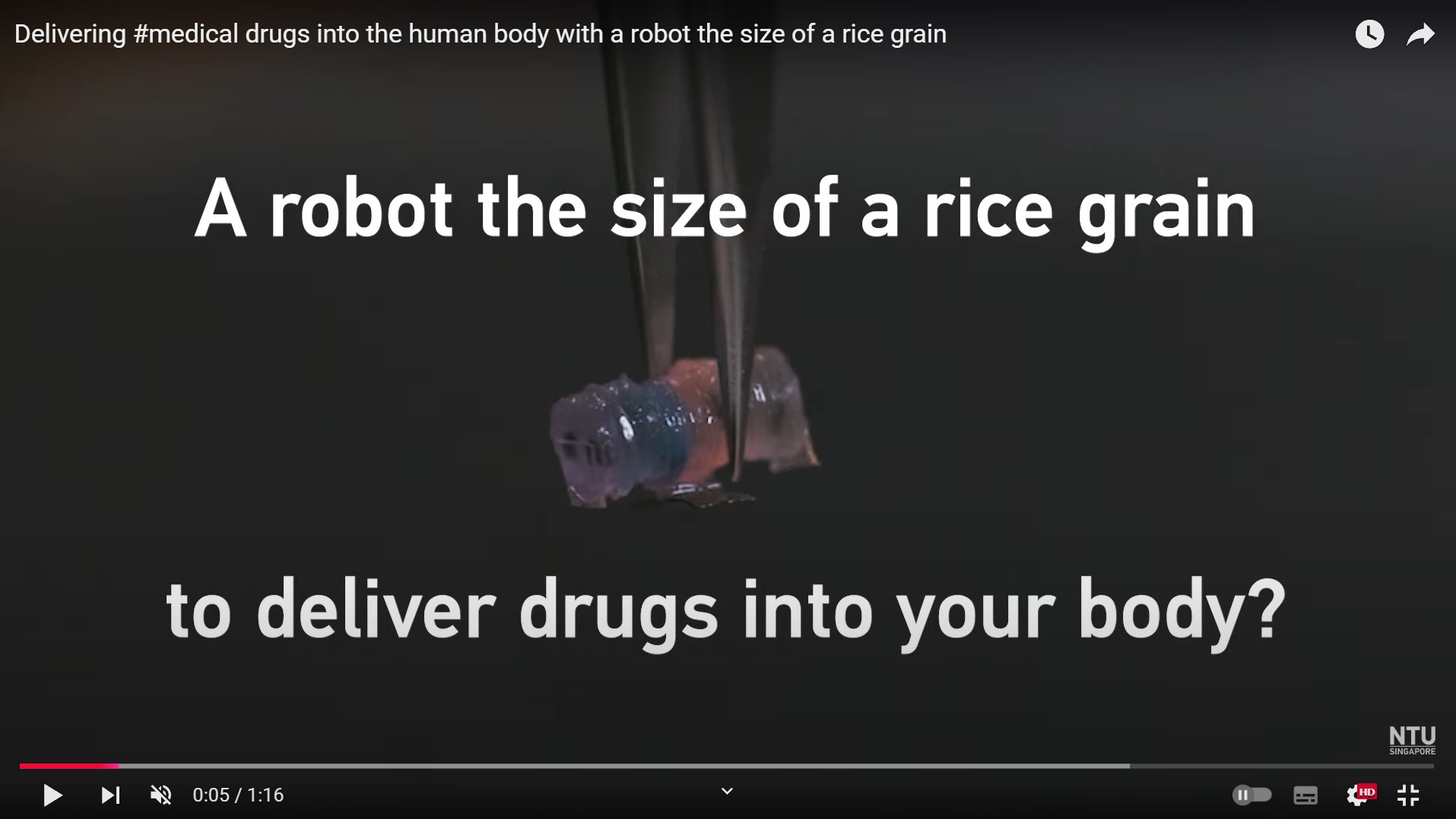 Des chercheurs de l'université technologique de Nanyang (NTU) à Singapour viennent de donner une nouvelle impulsion au projet de “gélules robots”, des micro-robots capables de se déplacer au sein du corps humain pour aider au diagnostic ou à la galénique : déposer des médicaments au cœur même de la zone malade. C’est le cas du robot singapourien, de la taille d'un grain de riz, capable de transporter et de délivrer plusieurs types de médicaments dans différentes parties du corps humain avec une grande précision. Ce robot, composé de matériaux magnétiques et de polymères biocompatibles, peut être guidé par des champs magnétiques pour atteindre des cibles précises dans l'organisme et y libérer des traitements de manière contrôlée.