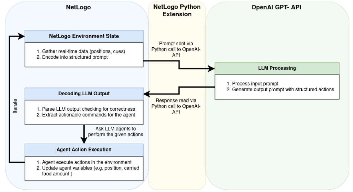 Diagramme illustrant la chaîne d'outils pour les simulations multi-agents pilotées par LLM, intégrant NetLogo et GPT-4o via l'extension Python et l'API OpenAI. • Cristian Jimenez-Romero et al.