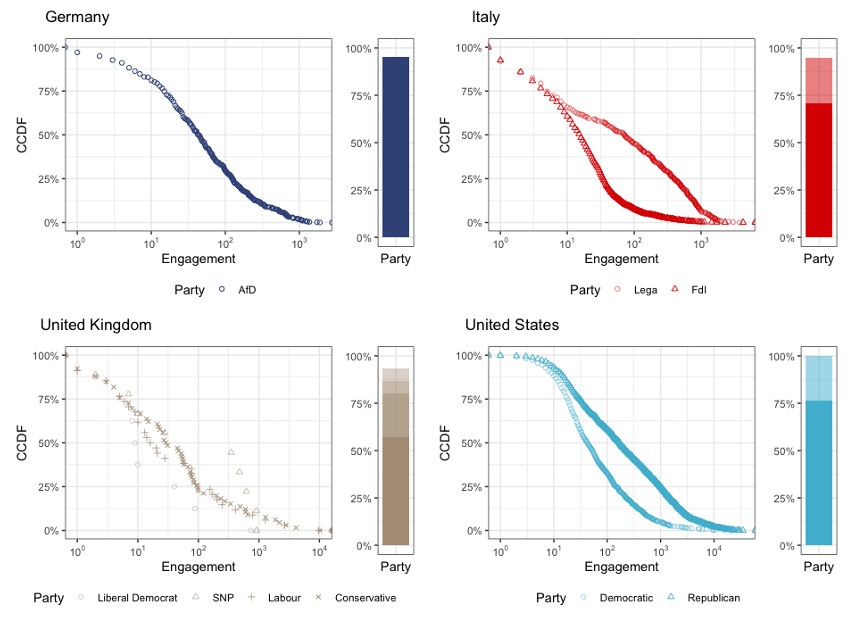 L’analyse des affiliations politiques des auteurs de tweets trompeurs révèle une tendance marquée : la majorité des contenus de désinformation provient de figures de la droite conservatrice et de l’extrême droite. En Allemagne, le parti Alternative für Deutschland (AfD) est responsable de 95,5 % des tweets trompeurs identifiés. En Italie, Fratelli d’Italia arrive en tête (70,7 %), tandis qu’aux États-Unis et au Royaume-Uni, ce sont respectivement les partis républicain (76,4 %) et conservateur (57,3 %) qui dominent cette tendance.