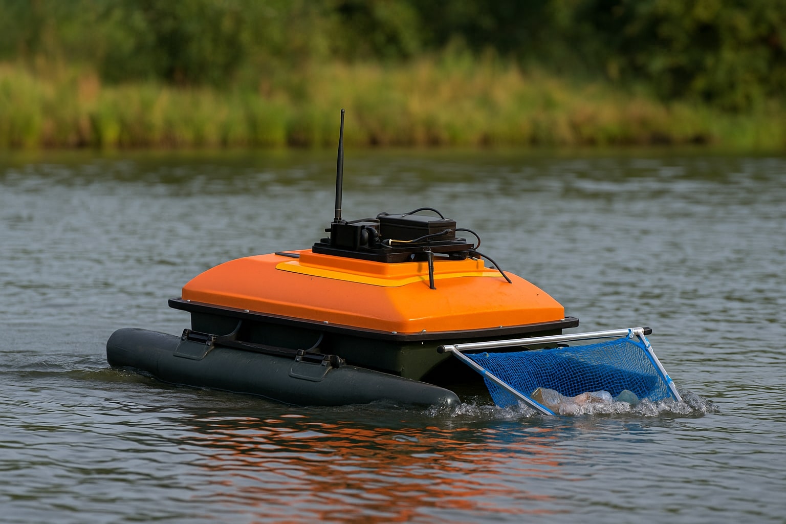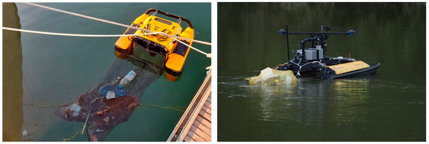 Exemples de véhicules de surface autonomes équipés de filets pour capturer les déchets flottants. • Luis F. W. Batista et al.