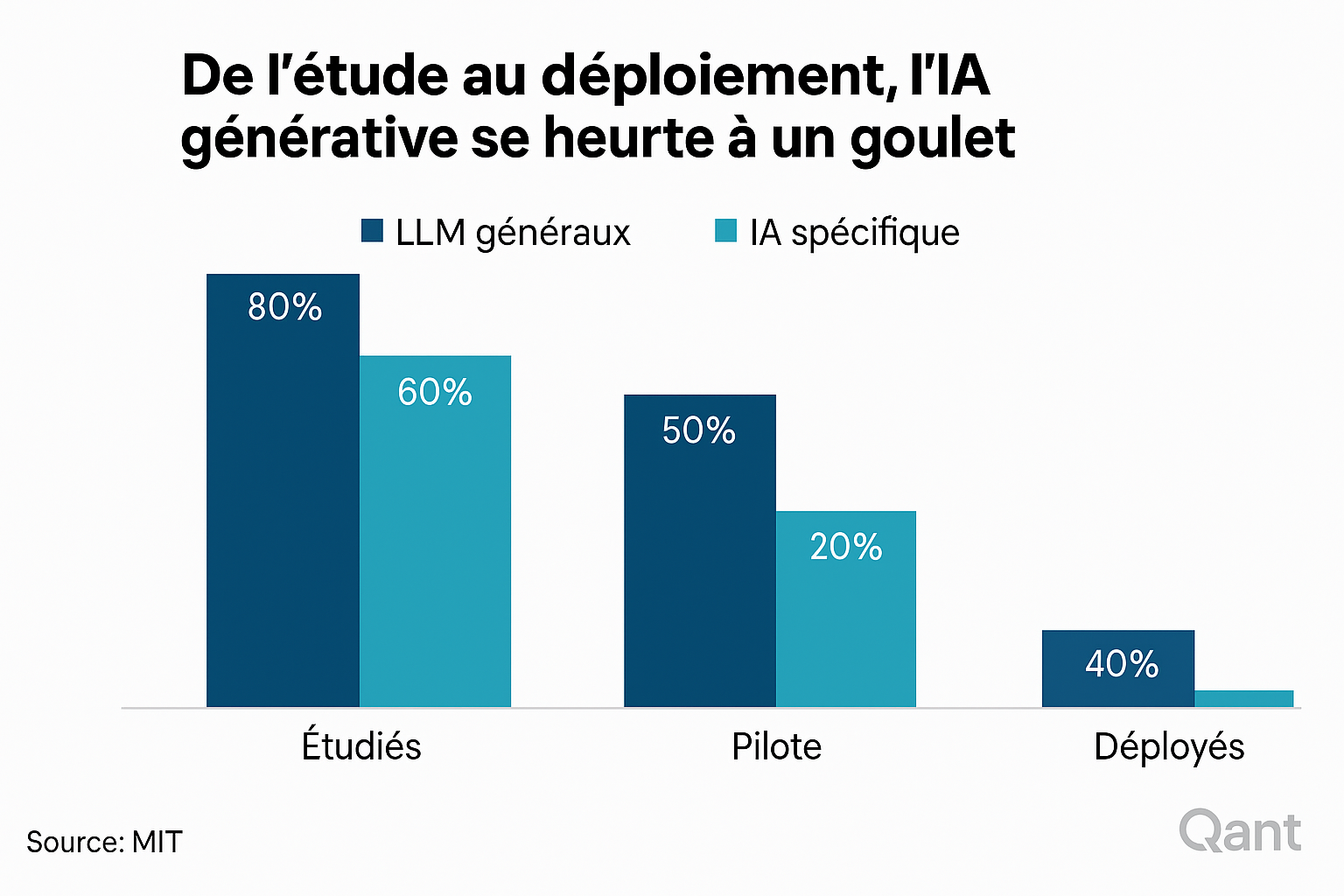 Les projets d’IA générative connaissent une forte attrition : 80 % des organisations explorent les LLM, mais seuls 40 % passent en production. Pour les outils spécifiques, le taux chute de 60 % étudiés à 5 % déployés.