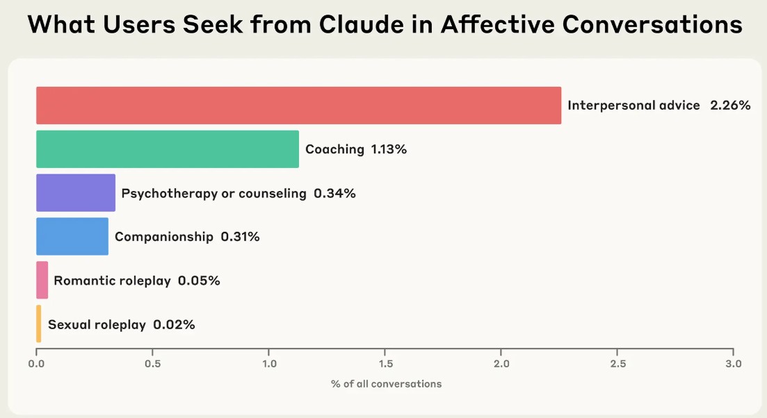 Les échanges de jeu de rôle à caractère sexuel ou romantique, interdits sur Claude, ne représentent que 0,1 % de l’ensemble et ont été écartés de l’analyse pour insuffisance de données.