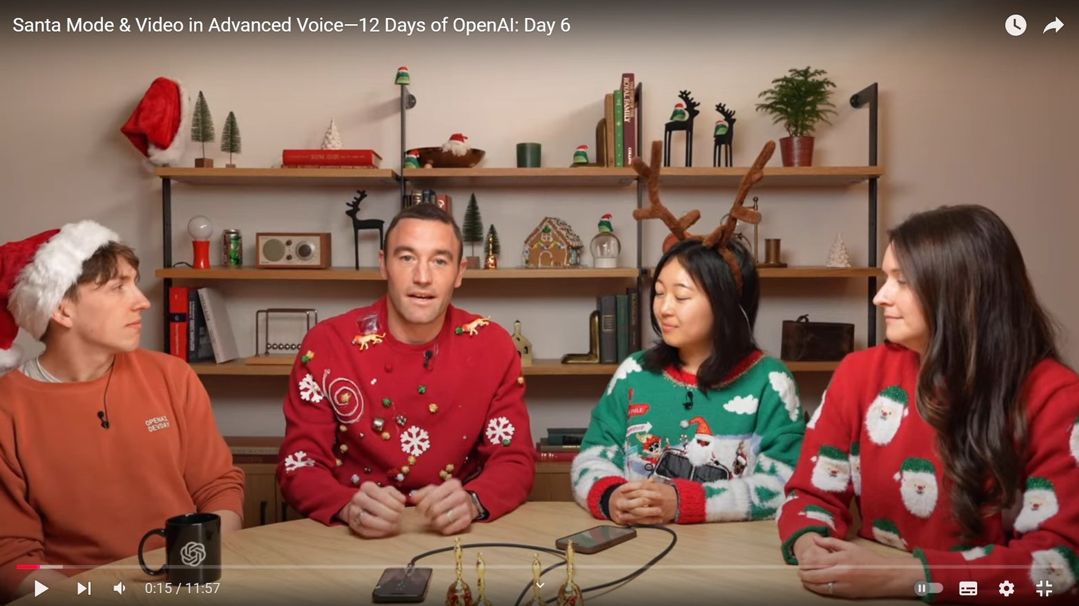 La Mère Noël a trouvé son Chat • Hier soir, OpenAI a commencé à rendre actives des capacités d’input vidéo à GPT-4o, similaires à celles d’Astra dans Gemini 2.0 ( ci-dessus). Le modèle continue de ne générer que de la voix et du son, du texte et des images mais sa capacité à suivre ce qui se passe sur l’écran de l’utilisateur permettra à Siri de rivaliser avec les assistants sur Android que rendra possibles Gemini. Pour une fois, Google aurait pu l’emporter sur le front de la communication, mais OpenAI a trouvé la parade : à partir de ce soir, ChatGPT permet de discuter en direct avec le Père Noël. Mieux que La Poste. En savoir plus…