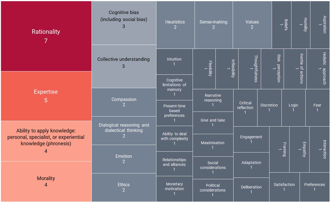 Le corpus d’analyse repose sur 45 attributs humains et 20 attributs liés à l’IA générative, identifiés respectivement dans une revue de portée et une revue rapide de la littérature scientifique récente. Ces attributs sont classés selon leur unicité, leur influence (favorable, défavorable ou contextuelle) et leur articulation conceptuelle. L’objectif était de déterminer si les humains disposent encore d’un avantage dans la prise de décision, et sous quelles conditions une coopération ou une convergence entre humain et IA est envisageable.
