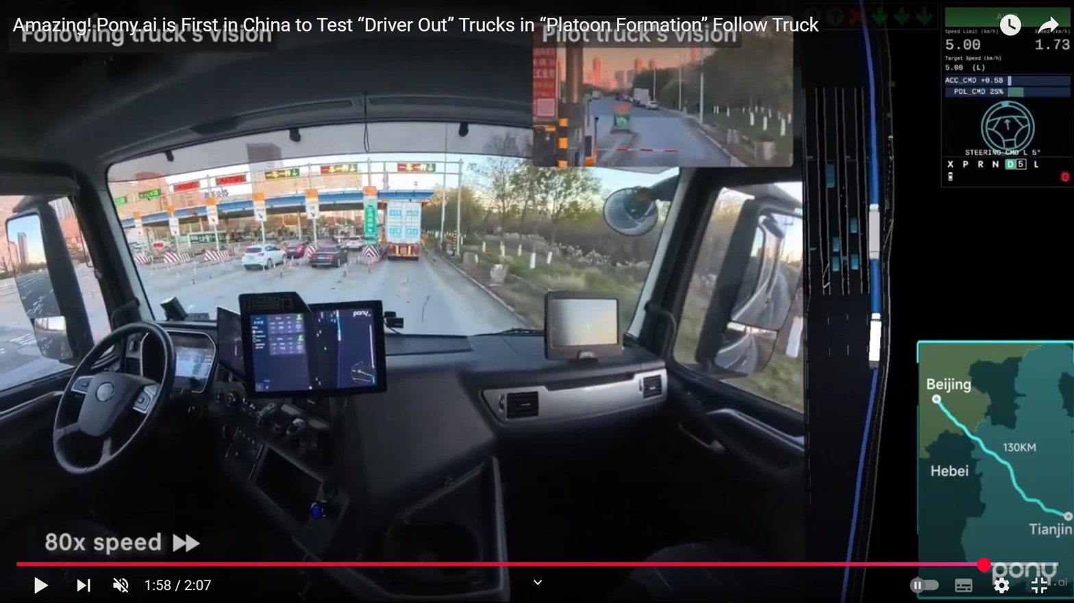 Un convoi de camions en Chine utilisant le système "driver out" de Pony.ai