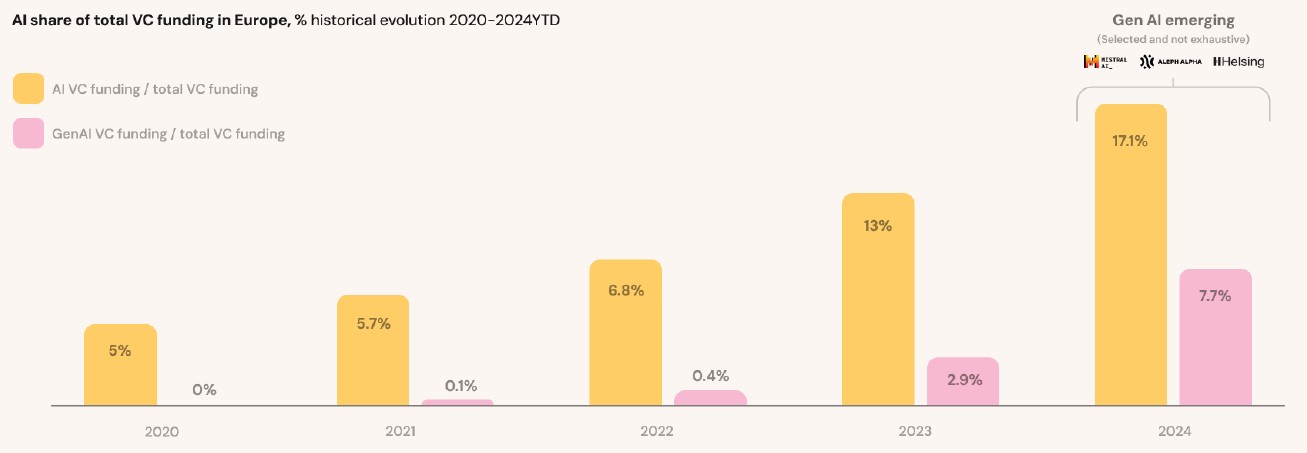 Part de l'IA et de la GenAI dans le financement total du capital-risque en Europe • Source : The French AI Report